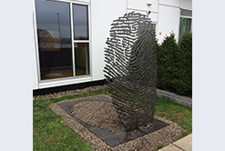 A second path of inquiry traces technology within the context of writing systems that have developed through human civilizations and are now merging into digital technologies that rely on a number of layers of sensory perception. I am integrating written languages both as an expression of human experience and as a series of sculptural elements in public contexts. I am creating sculptures that depict language and ideas that respond to the characteristics and history of the environments in which they are installed. The form of this body of work and its core subject, written language, is an evolution of concepts that I started to explore in my pieces Arrest, Table Talk, and The Book. I am continuing to make sculptures that use the characteristics of written language, such as book forms, codes, and type to investigate the phenomena of printed or written language. The goal is to merge sculptural forms with linguistic forms in order to extend the relationships between the physical experience of seeing language sculpturally while reading.